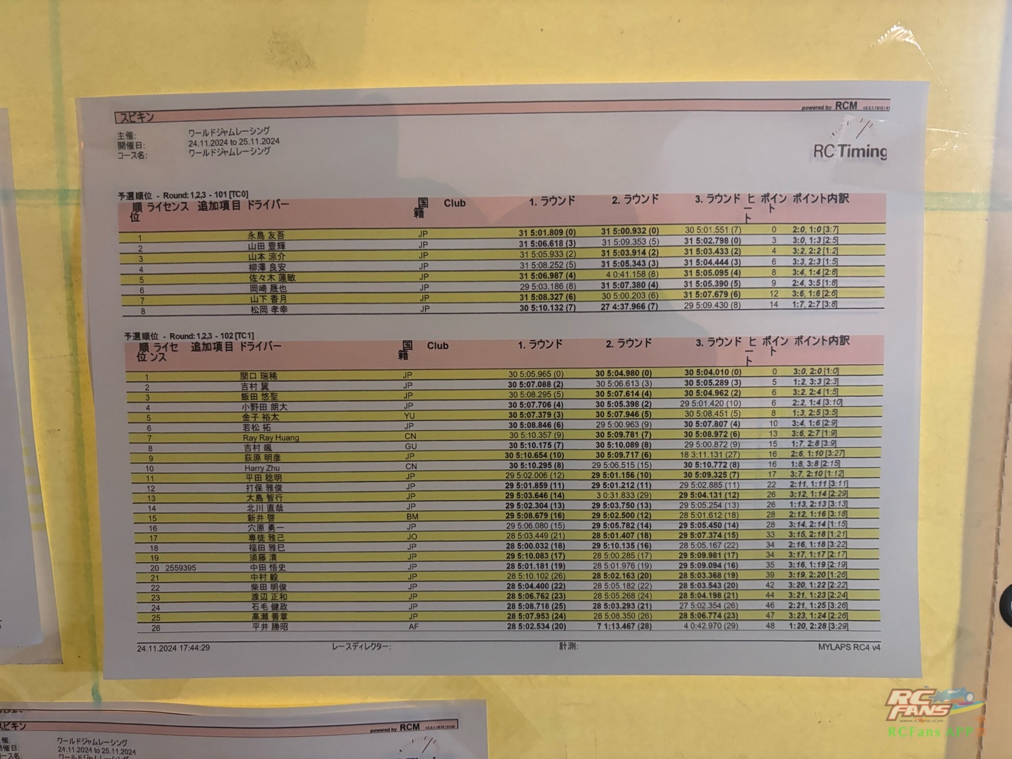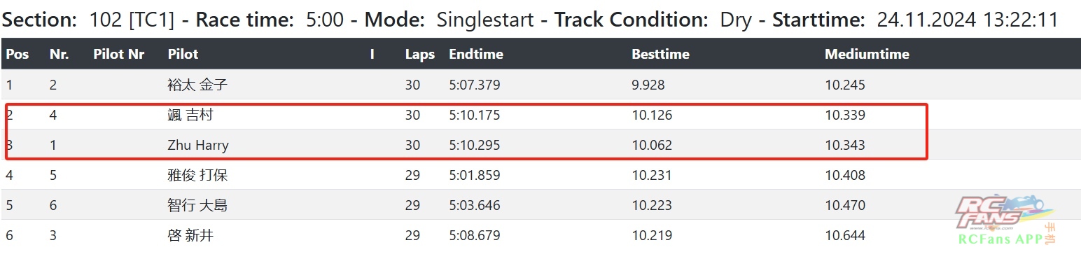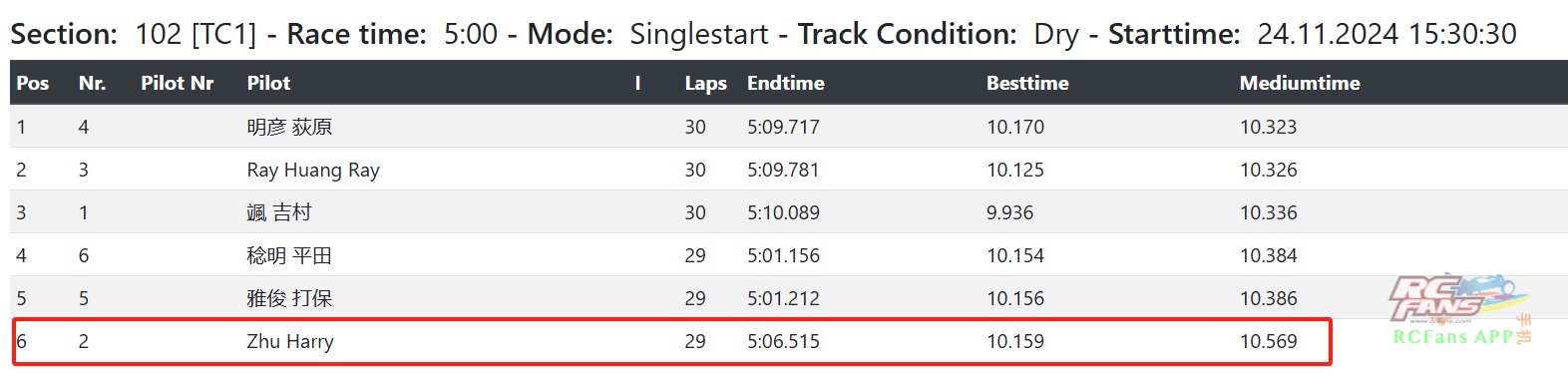 预赛大约是6-7人一组,我被分在了TC1的第三组(共6组),我这轮有两位高手:来自本地赛道的iris车手金子裕太和吉村飒,而我又是第一个发车,一定会给他们让车从而影响速度。 一如既往的进入节奏慢,第一圈直接跑了个11.0秒,落到倒数第二。好在第二圈开始进入了节奏,稳定在10.1-10.3秒。水平实在是太接近,即使我连续做出10.2/10.1/10.0/10.2/10.1/10.2的好成绩,但是因为我第一圈的失误,第一分钟结束我仍然还在第四位。一分半后我超过了第二名吉村的pace,暂时升到第二,但是此时已经落后头名金子1.5秒,他也追到了我身后,我马上需要给他让车。让过头车后我努力跟着他,同时我在这时候也发现了我的车相对的非常推头,,跟了三圈后在左边的一个弯道失误,于是再也没有追赶上。最后小组3车收车,跟2车差距0.12秒,最快单圈10.062,仅次于头车,其实我对这个成绩很满意。看了一眼每圈的时间,也比较稳定,。 ![]() ![]() ![]() ![]() ![]() |