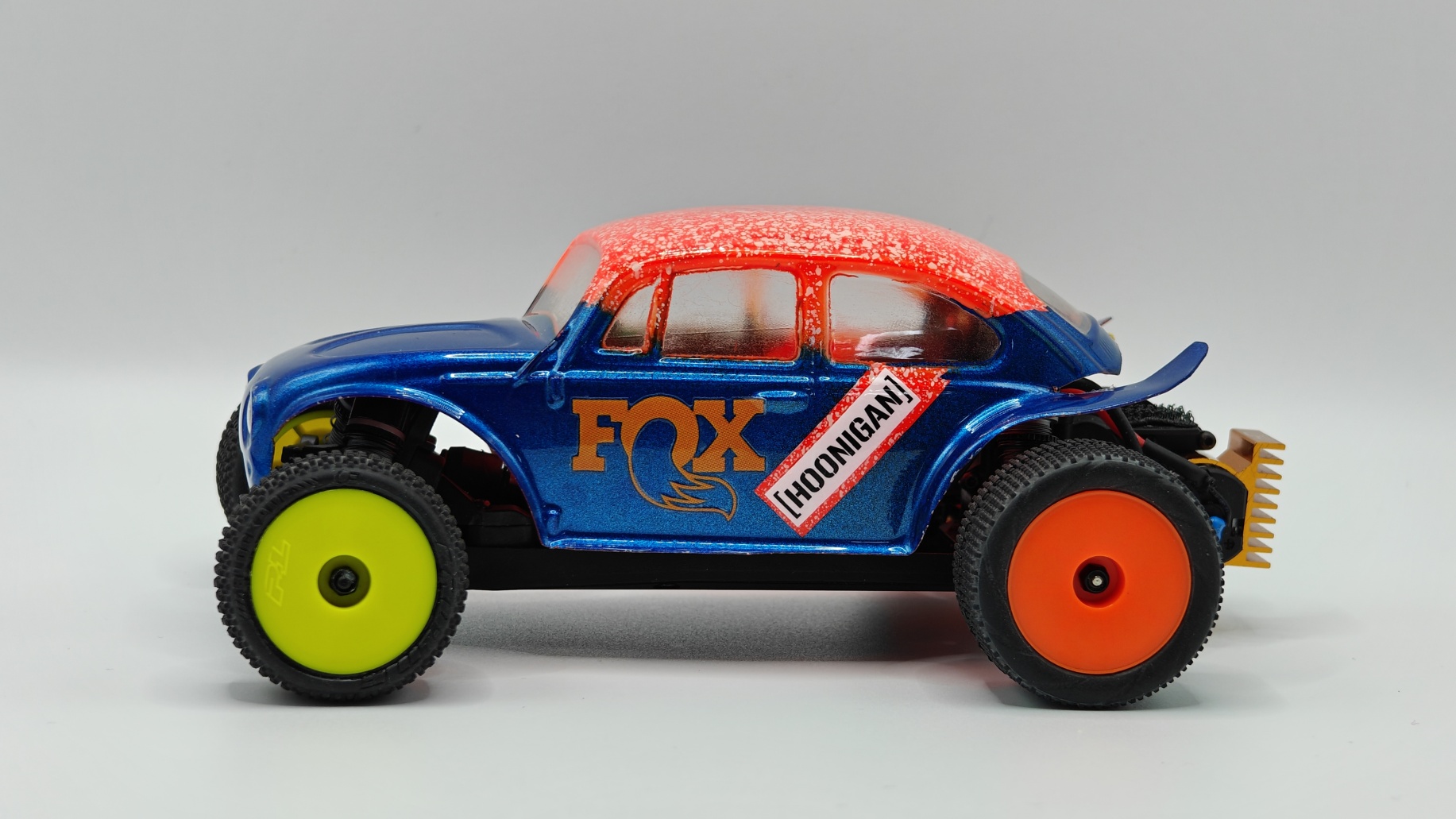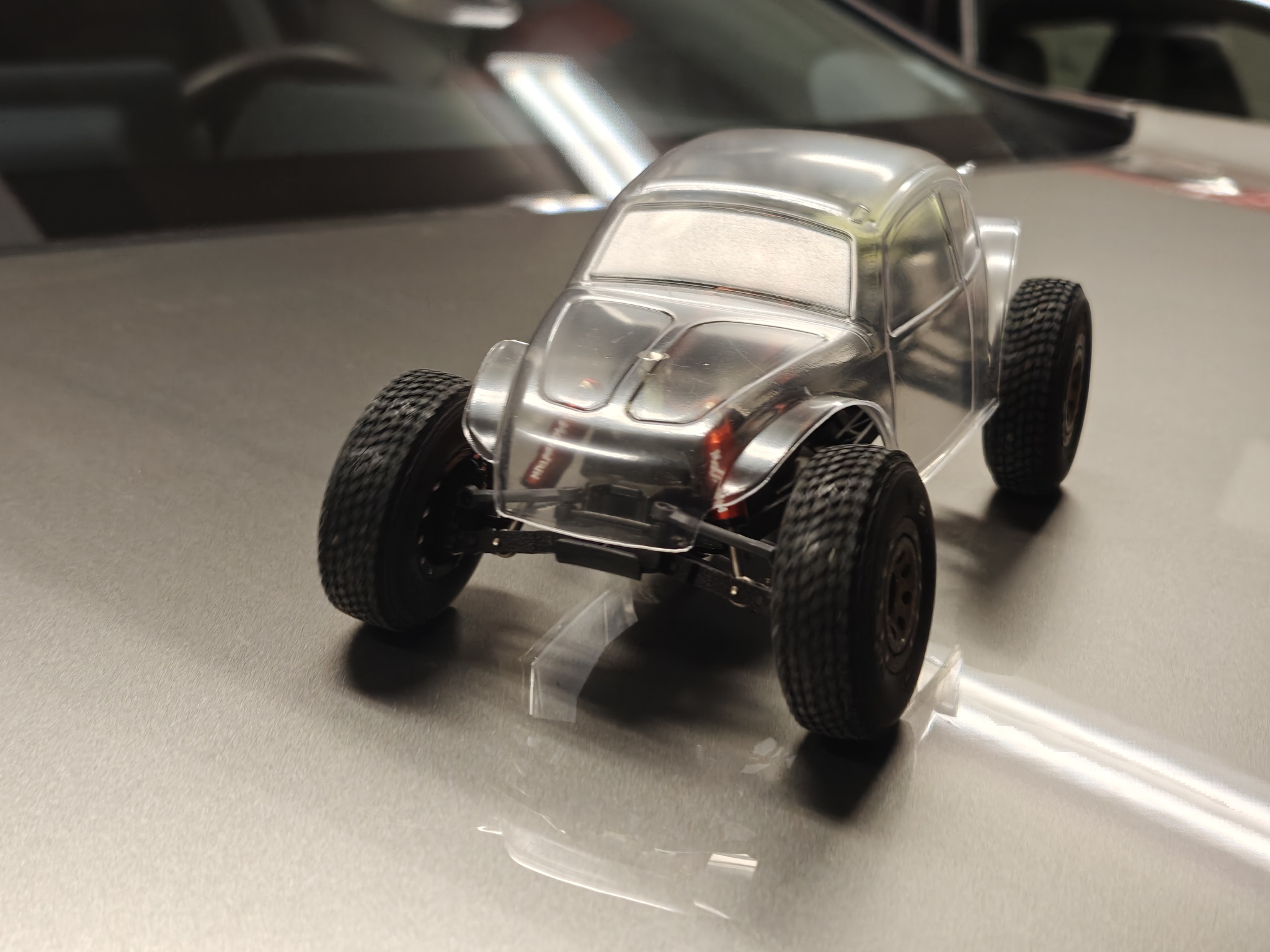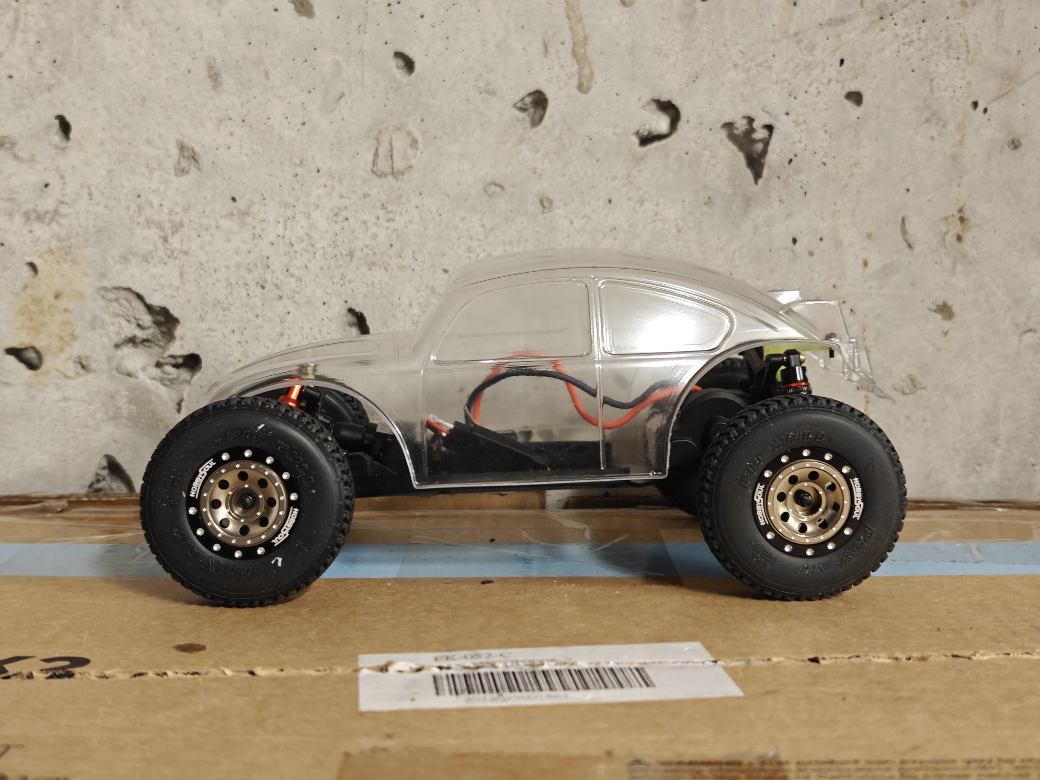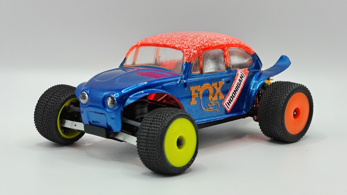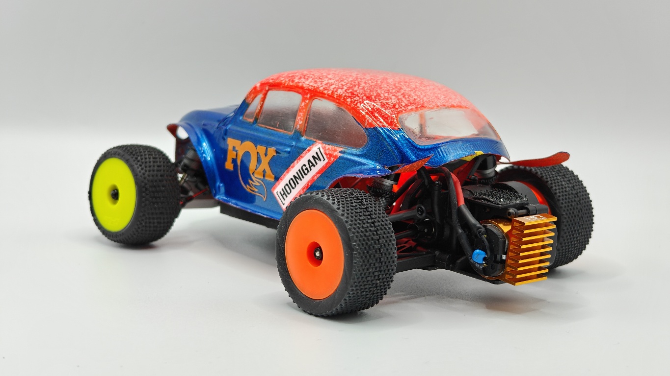 Micro-B,很好玩的一台小Buggy。因为是后驱,不敢换动力,其他也没啥可改的。换壳玩吧。先是缩短了轴距,变身萌版金龟子。![]() ![]() ![]() 车壳是之前雪橇车用的。前轮是本来的后轮,后轮是京商buggy的后轮。主打一个又短又粗,卖萌。 然后再来加长轴距,提高底盘,换大轮胎。车壳是In家的Baja Bugs 。本来想大幅提高底盘的,但前悬挂的结构严重限制了移动行程,不装避震,也就那个高度。于是切了部分A臂,终于把下止点改善了一点点。换了稍微长一点的避震。 前悬避震是之前做KOH烈马剩下的一对。后悬避震,因为没其他合适的长度,又开了一套新的,用两条废两条 ![]() ![]() ![]() ![]() 超喜欢这套轮毂和轮胎。 轮毂可以有两种Offset,我用的是窄距。轮胎的花纹很精致,很Baja。车壳还没喷漆,没想好弄个啥色。外观也想做得更丰富一些,更符合Baja风格,只是喷漆也没啥意思。 |